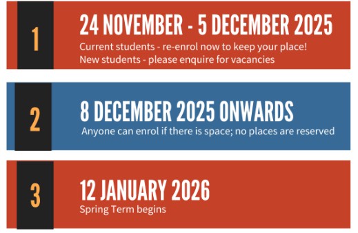 Not long to wait now until Spring Term enrolment begins. The Spring brochure will be available towards the end of November but current students can enrol early from 24 November. Check out the key dates below:
